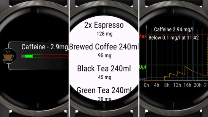 O usuário pode registrar diretamente no relógio o consumo de café, chá, refrigerante, energético e outras bebidas com cafeína, sem depender do celular. Com base nessas informações, o sistema estima o nível atual de cafeína no corpo, utilizando o peso corporal e o tempo de metabolização da substância.